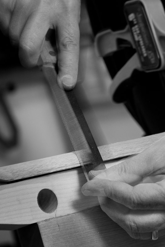 | Woodworking tools of the trade (some of which are themselves works of art), being used to scallop the internal bracing. |